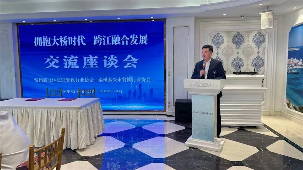 会议最后,新北区烹饪餐饮行业协会会长进行总结发言,希望两地协会以后加强联系,"以食为媒,以桥为纽,把"两岸一家亲"的情谊融入每一道菜品中,让餐饮成为常泰跨江融合的温暖纽带,共同书写两地经济繁荣发展的新篇章。